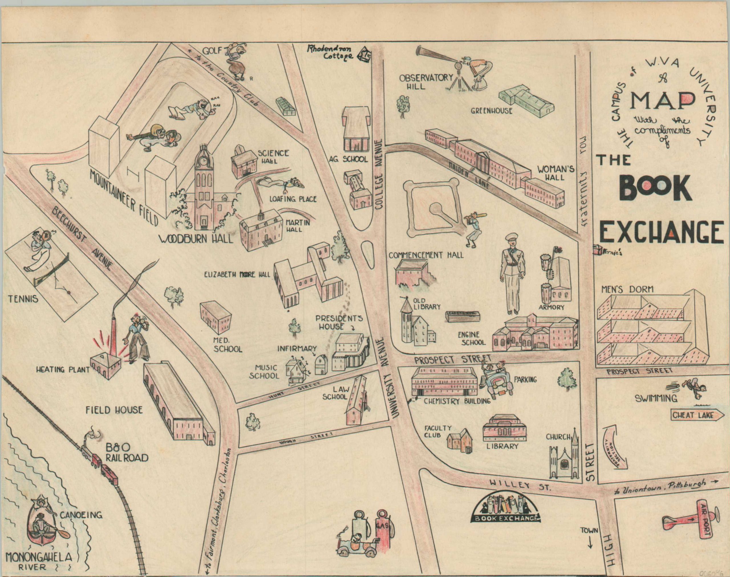 Probably prepared in 1935, based on the presence of the Men’s Dorm (completed that year) and not yet renamed. Issued compliments of the Book Exchange, a local bookstore that began operations in Morgantown in 1932 and is still in operation today.