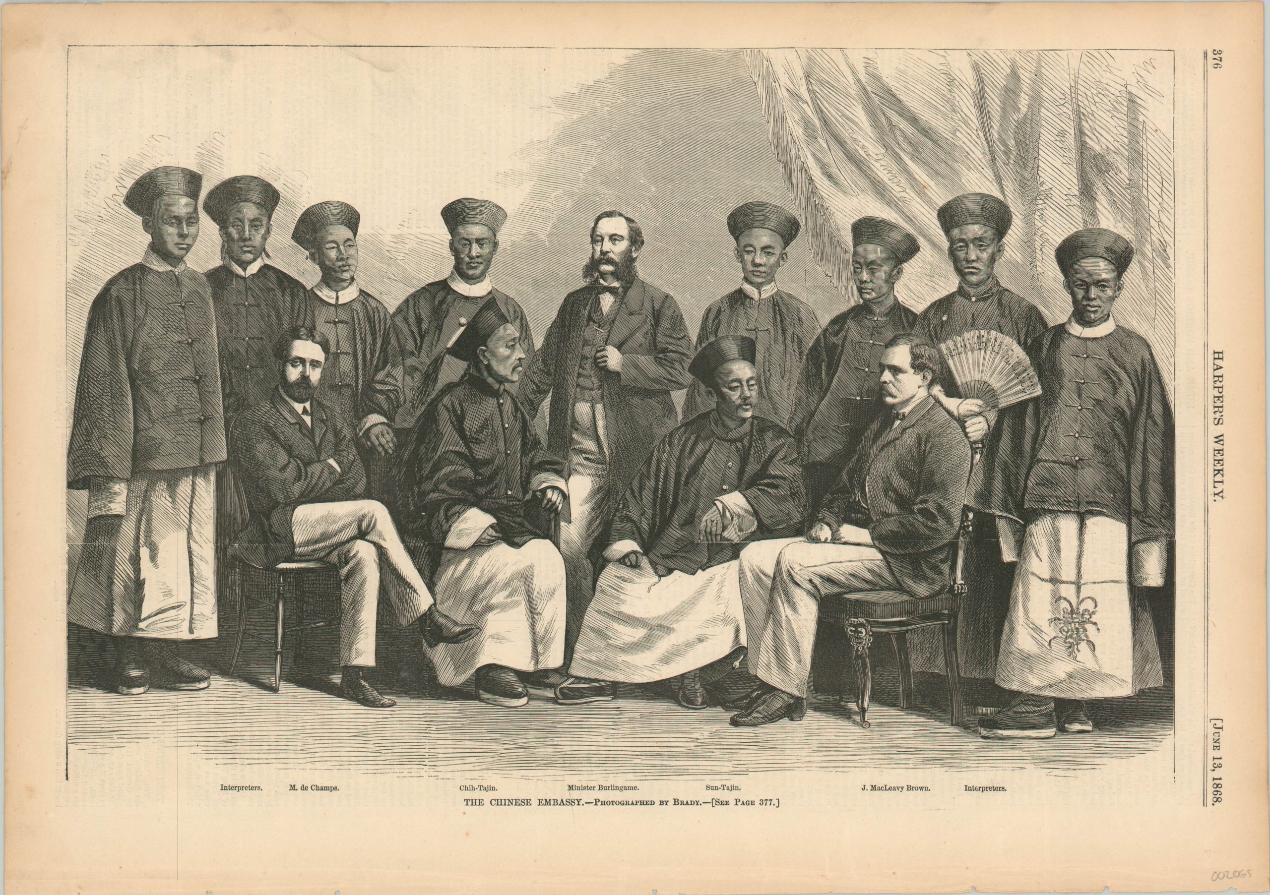 Mr. Burlingame takes the place of honor on this woodcut engraved scene based on a contemporary photograph of the delegation. He is flanked by two other European secretaries, two Chinese dignitaries, and a number of interpreters.
