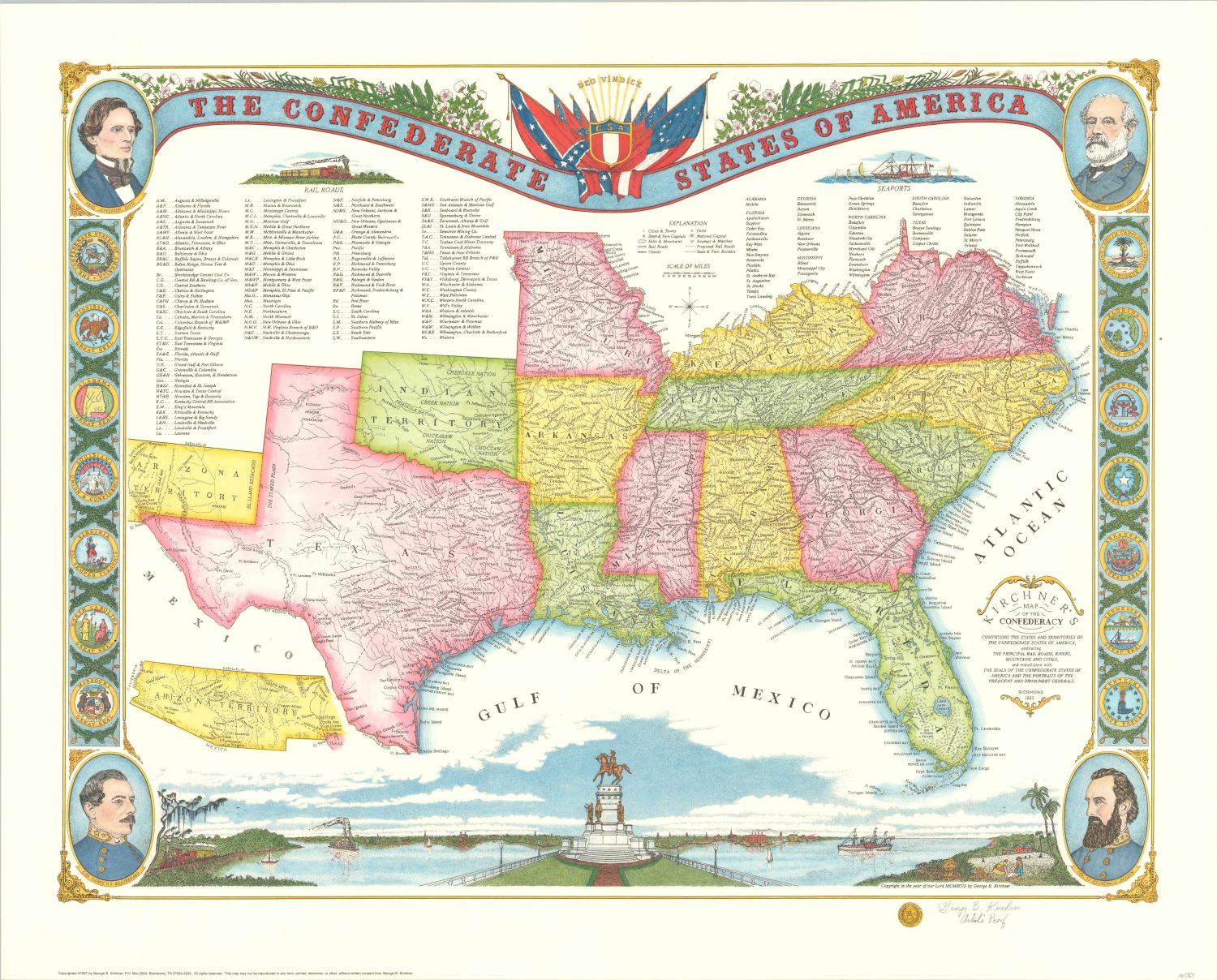 This attractive map of the southern United States was designed in 1997 by Tennessee artist/historian George Kirchner to provide an allegedly untold perspective of the Confederate States of America. It shows the borders of the C.S.A. to its maximum planned extent in 1863, “or as it would have existed without interference by the Union military”, according to the accompanying description.
