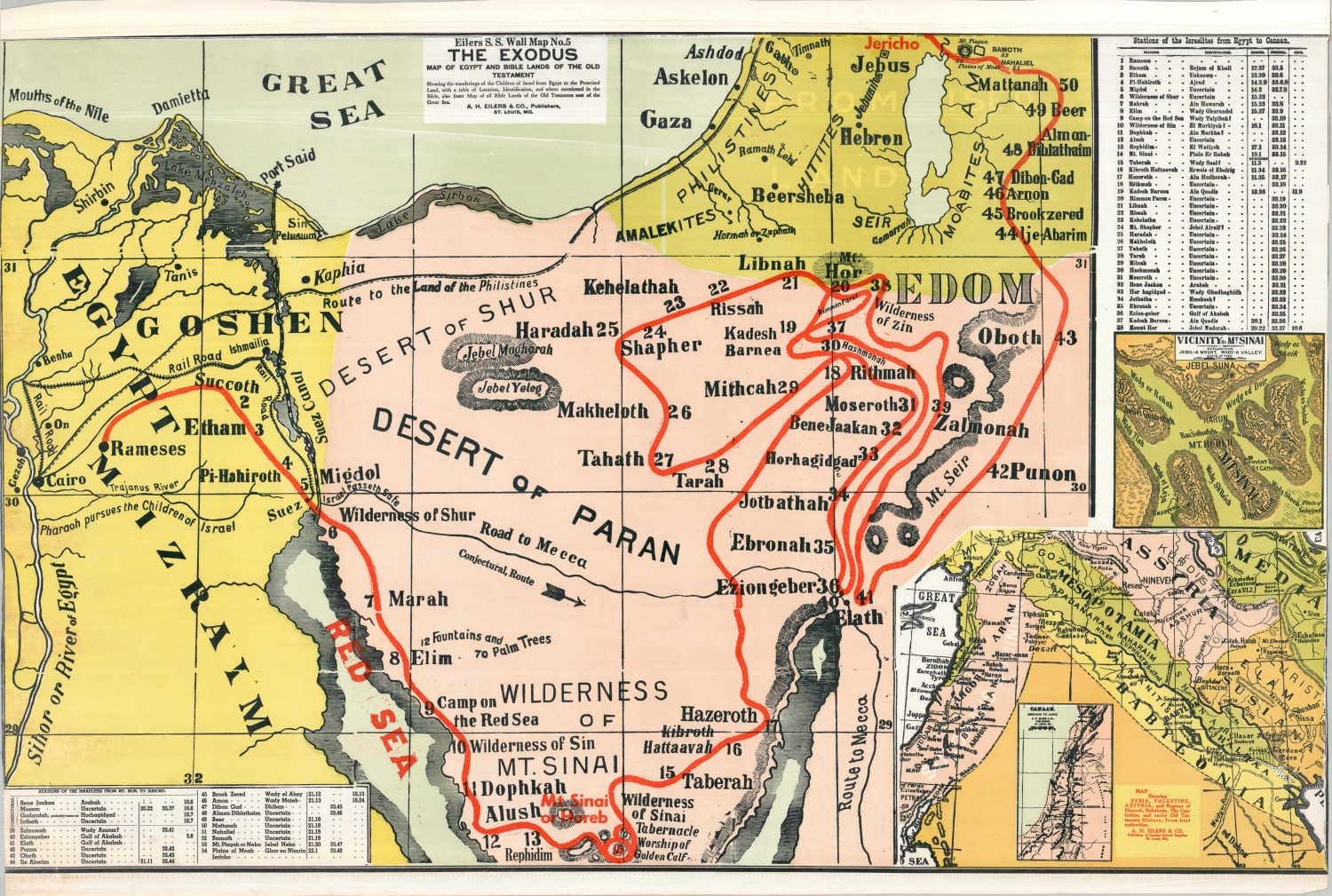 This large and brightly colored wall map was designed and issued as a teaching aid for juvenile education on Biblical subjects. The image highlights the route of the Israelites as they fled captivity from Egypt and wandered the desert for 40 years before finally arriving in the Promised Land. The fifty-four stations, or stops, along the route (some of which are conjectural) are listed in accompanying indices. Insets in the lower right present more of Palestine and the Levant, as well as the area around Mt. Sinai. Interestingly, the image also notes contemporary railroad lines, the Suez Canal, and the pilgrimage route to Mecca.