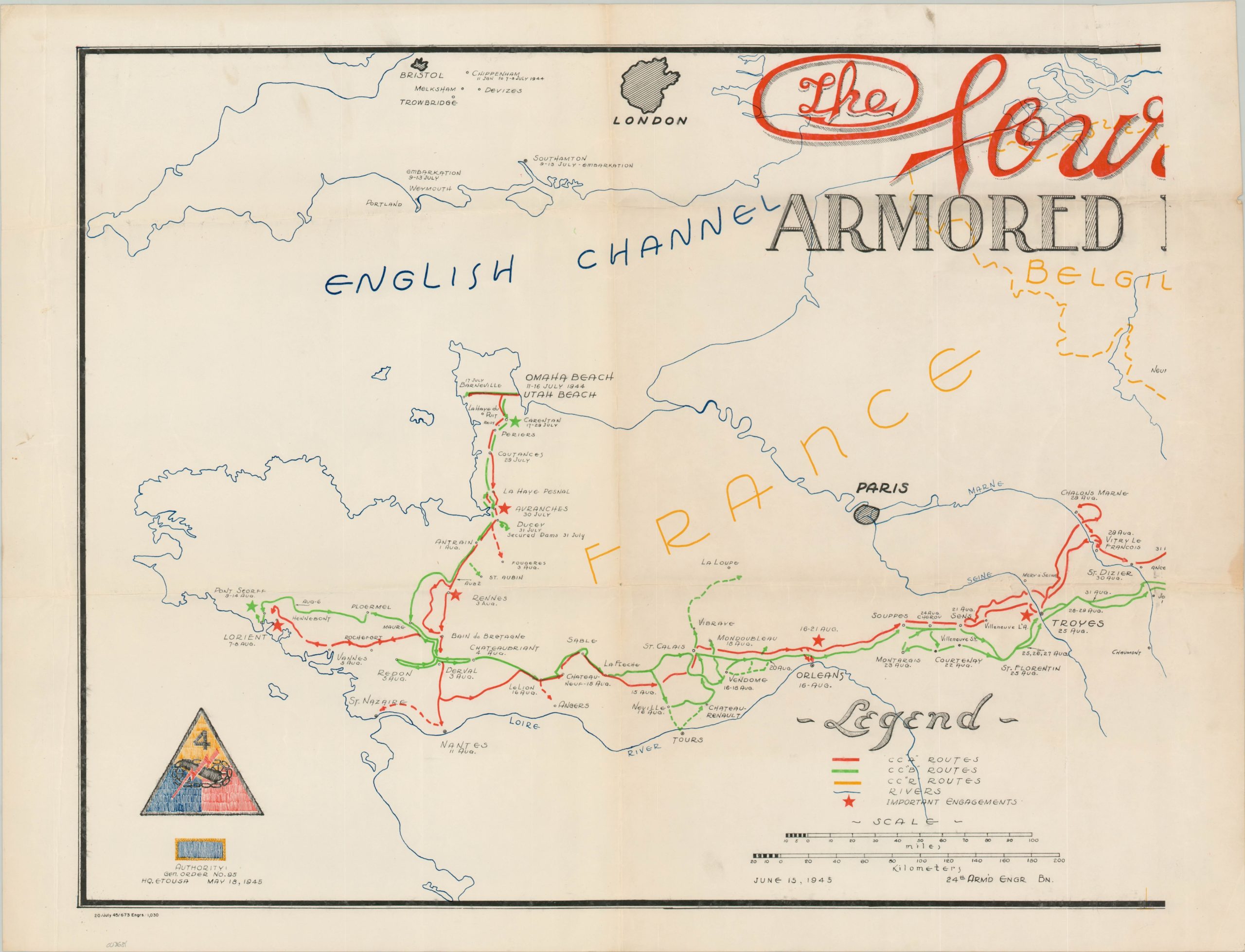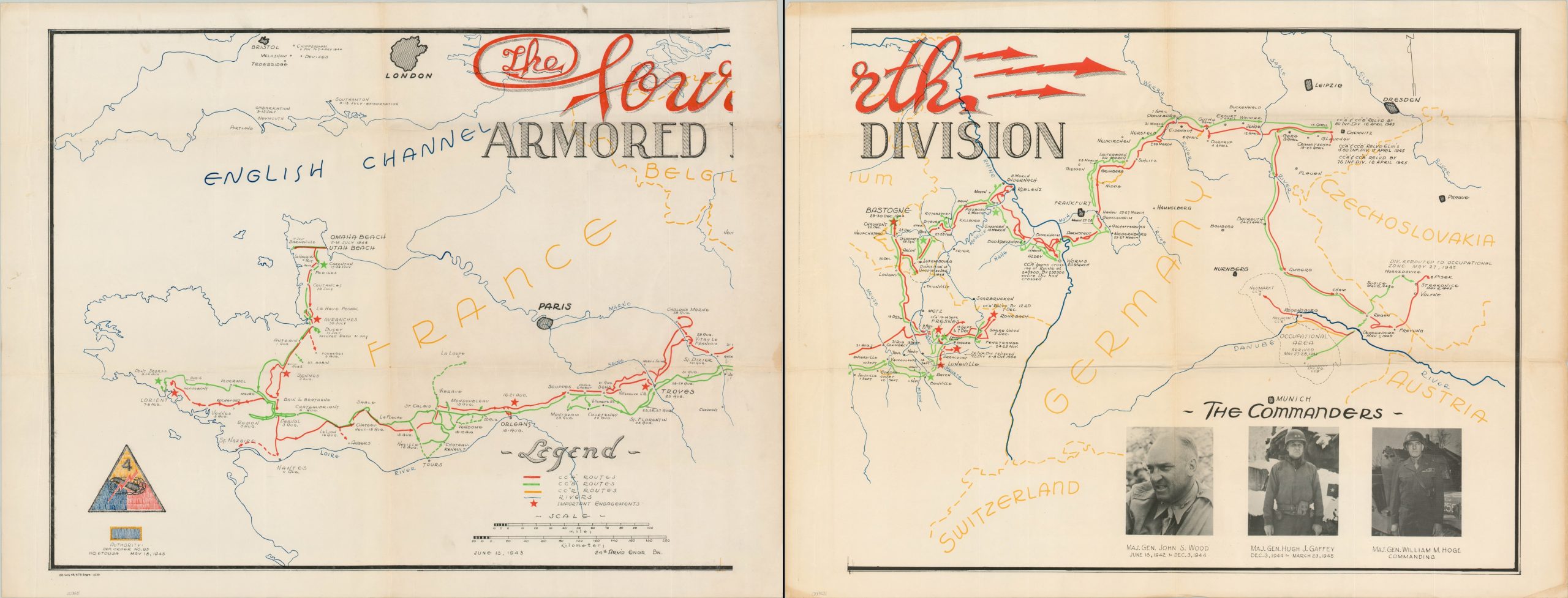 The experiences of the Fourth Armored Division during World War II were so tremendous that they couldn’t fit onto one page! This tremendous two-sheet map depicts the unit’s campaign across Europe, from landing in Normandy in early July 1944 to the assigned occupational area in Germany in late May of 1945.