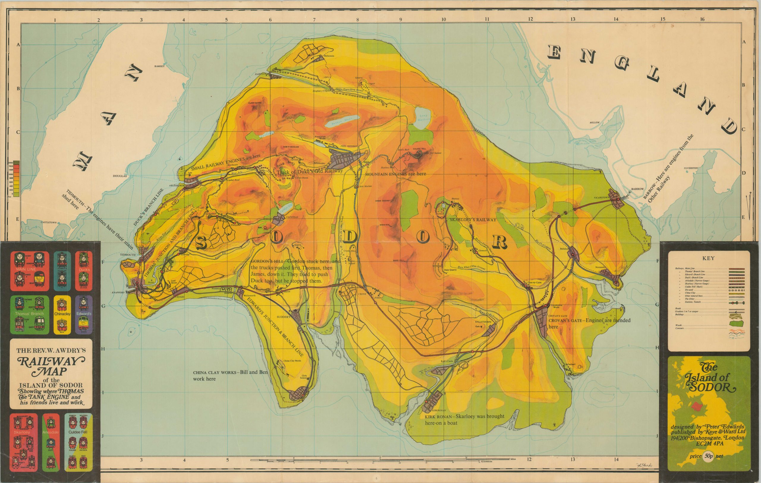 Situated off the western English coast, in the Irish Sea, lies the fictional Island of Sodor. It is the home of the beloved character, Thomas the Tank Engine, created by Wilbert Audrey and first introduced in the Railway Series in 1945. The first railway map of Sodor appeared in 1949, with numerous subsequent editions updating the geography according to the adventures of Thomas and his friends.