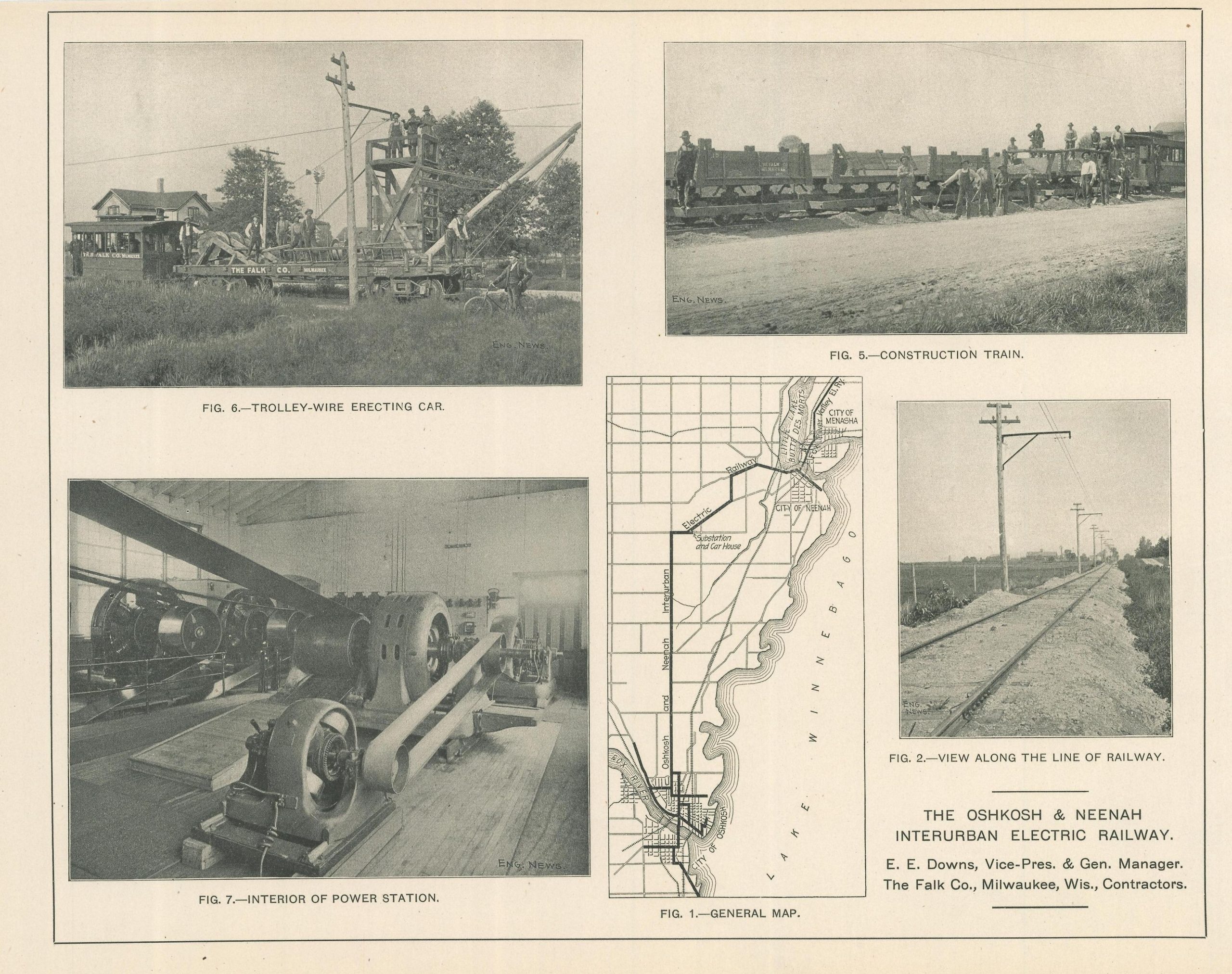 This anonymous print was issued in the first few years of the 20th century to highlight the operations of The Oshkosh & Neenah Interurban Electric Railway. A simple map showing the route between Oshkosh and Neenah, Wisconsin is accompanied by photographs of the Trolley-Wire Erecting Car, the Construction Train, the Interior of the Power Station, and a View Along the Line of Railway. According to a contemporary issue of Engineering-News Record;