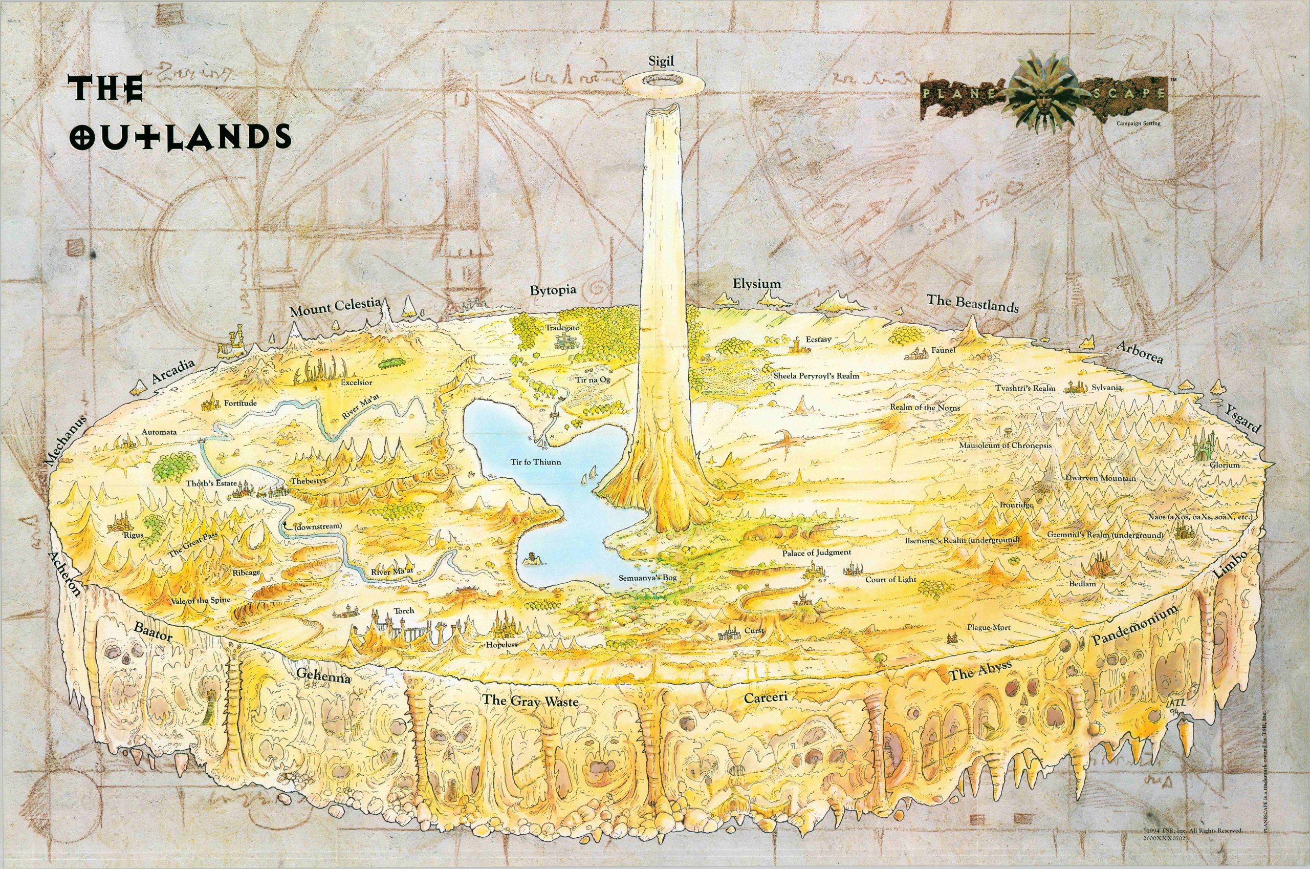 This fantastical map presents a pictorial overview of the Outlands, a central mythological realm in the Planescape campaign setting. It is a realm of rolling hills and temperate countryside that acts as the center of the Great Wheel cosmology, connecting to all other Outer Planes via 16 “gate-towns”. Various features are labeled, all surrounding the central Spire, topped by the Sigil.
