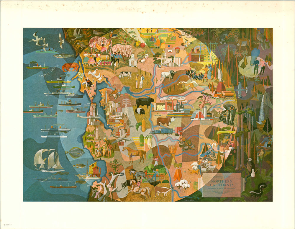 This gorgeous abstract pictorial map of northern California depicts the area roughly from Monterrey to Santa Rosa, and inland as far as Lake Tahoe. The region’s abundant natural resources, manufacturing, metropolitan areas and tourist attractions are the clear focus and include beautiful illustrations of wine making in Napa Valley, skiing in Tahoe, and farming in the Central Valley.