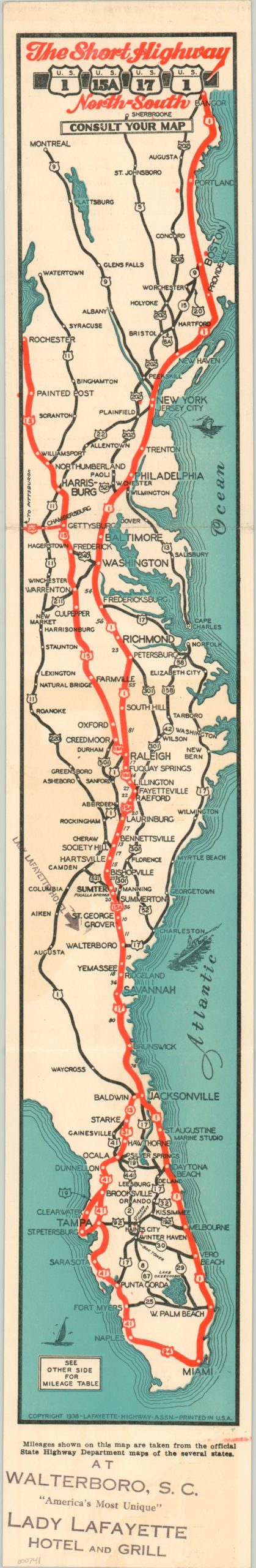Strip map advertising for the shortest route from north to south via U.S. Highways 1 and 15.