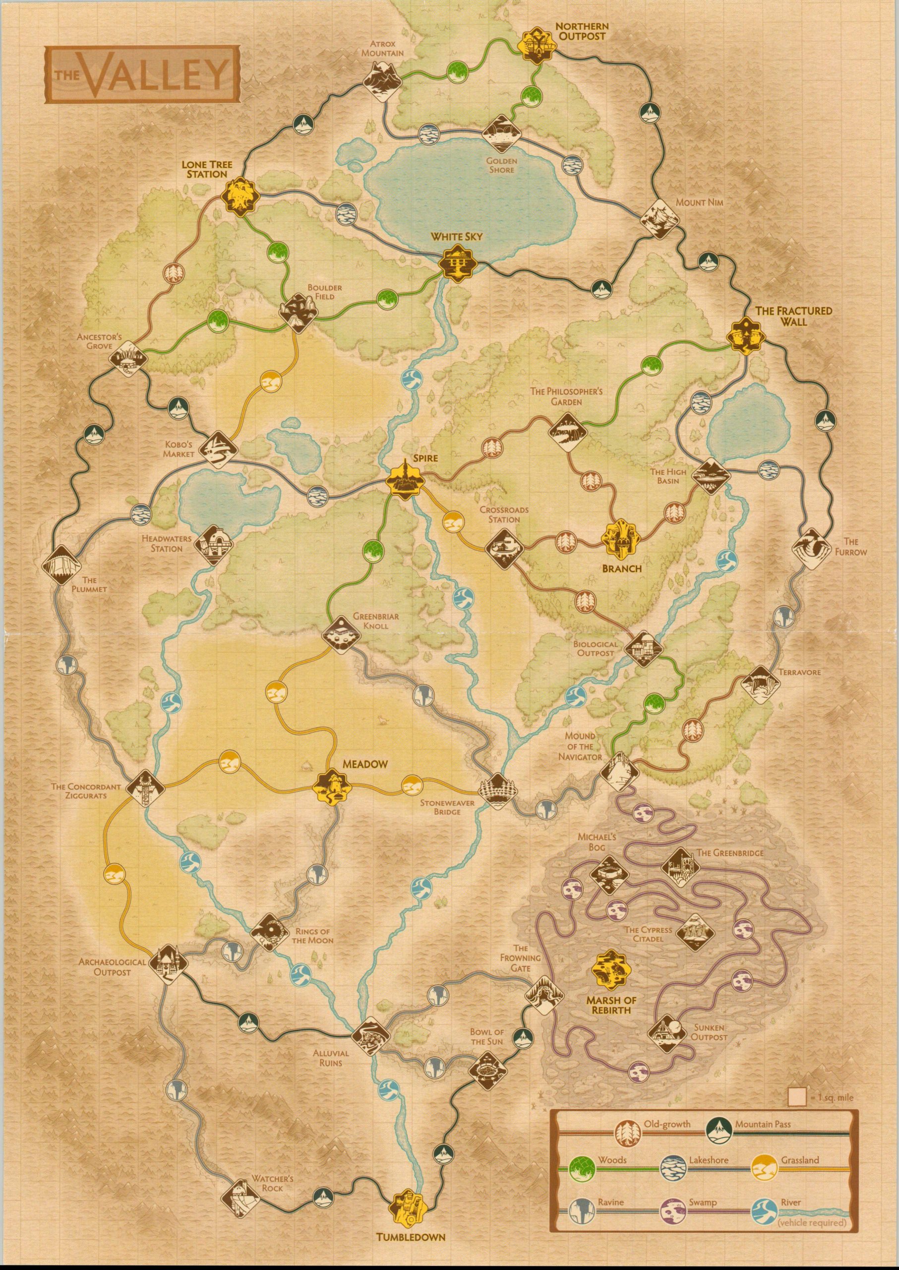 This pair of game maps shows The Valley, the playable setting for Earthborne Rangers. According to their website: “Earthborne Rangers is a customizable, cooperative, adventure card game set in the wilderness of the far future for 1 – 4 players. You’ll begin by building a deck that reflects your character’s personal history. Then, as you explore the open world and your story takes shape, You’ll augment your deck with improved equipment, refined skills, and the memories of your journey.”