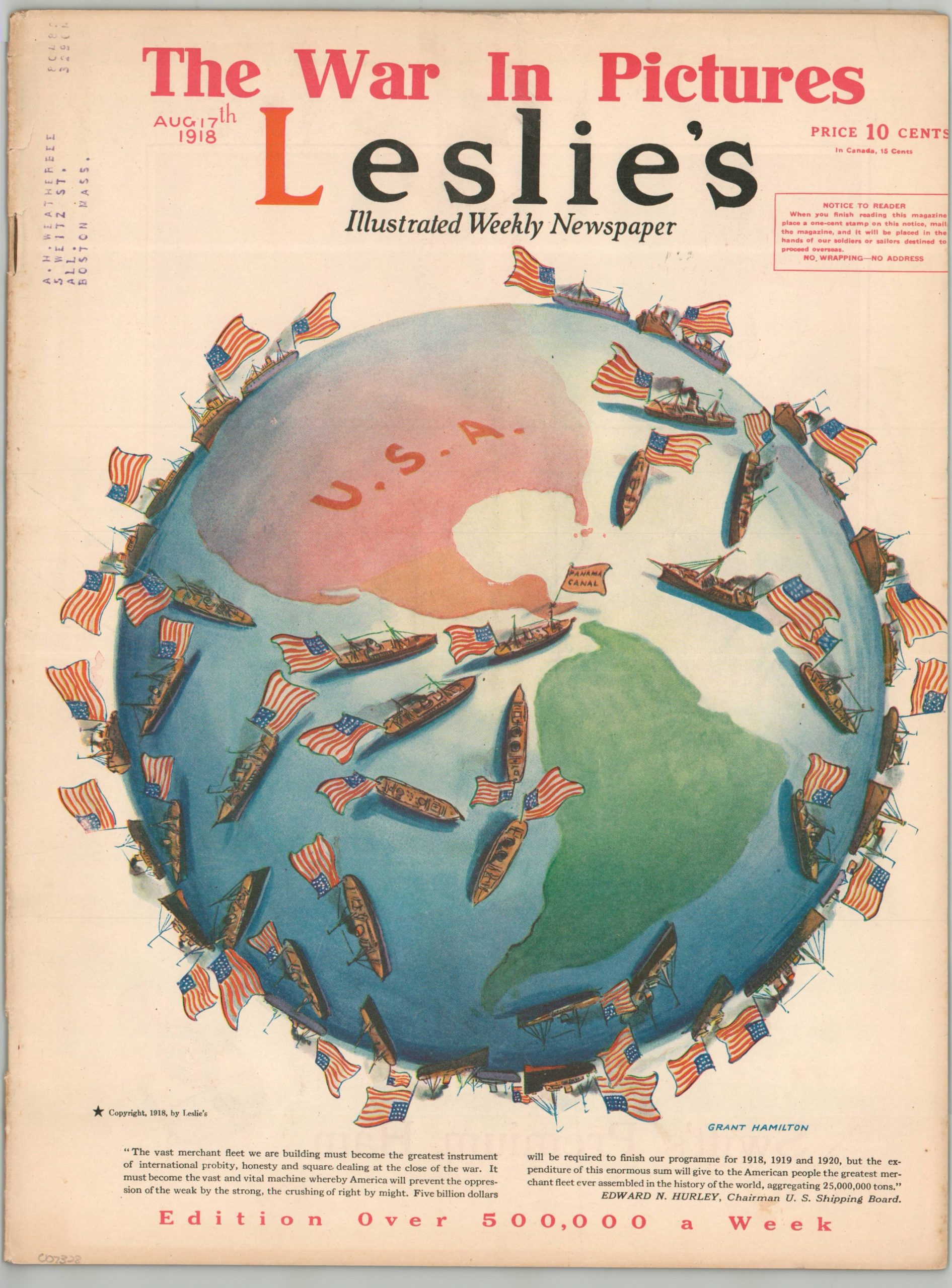 This cartographic cover to the August 17, 1918 issue of Leslie’s Illustrated Weekly Newspaper was designed by Grant Hamilton and highlights America’s astonishing ongoing shipbuilding efforts. One will notice that the numerous vessels are all sailing particularly close to home waters, with the battlefields in Europe relegated to ‘somewhere over the horizon.’ A quote from Edward N. Hurley, Chairman of the U.S. Shipping Board, at the bottom of the page is already looking towards to the end of the war.