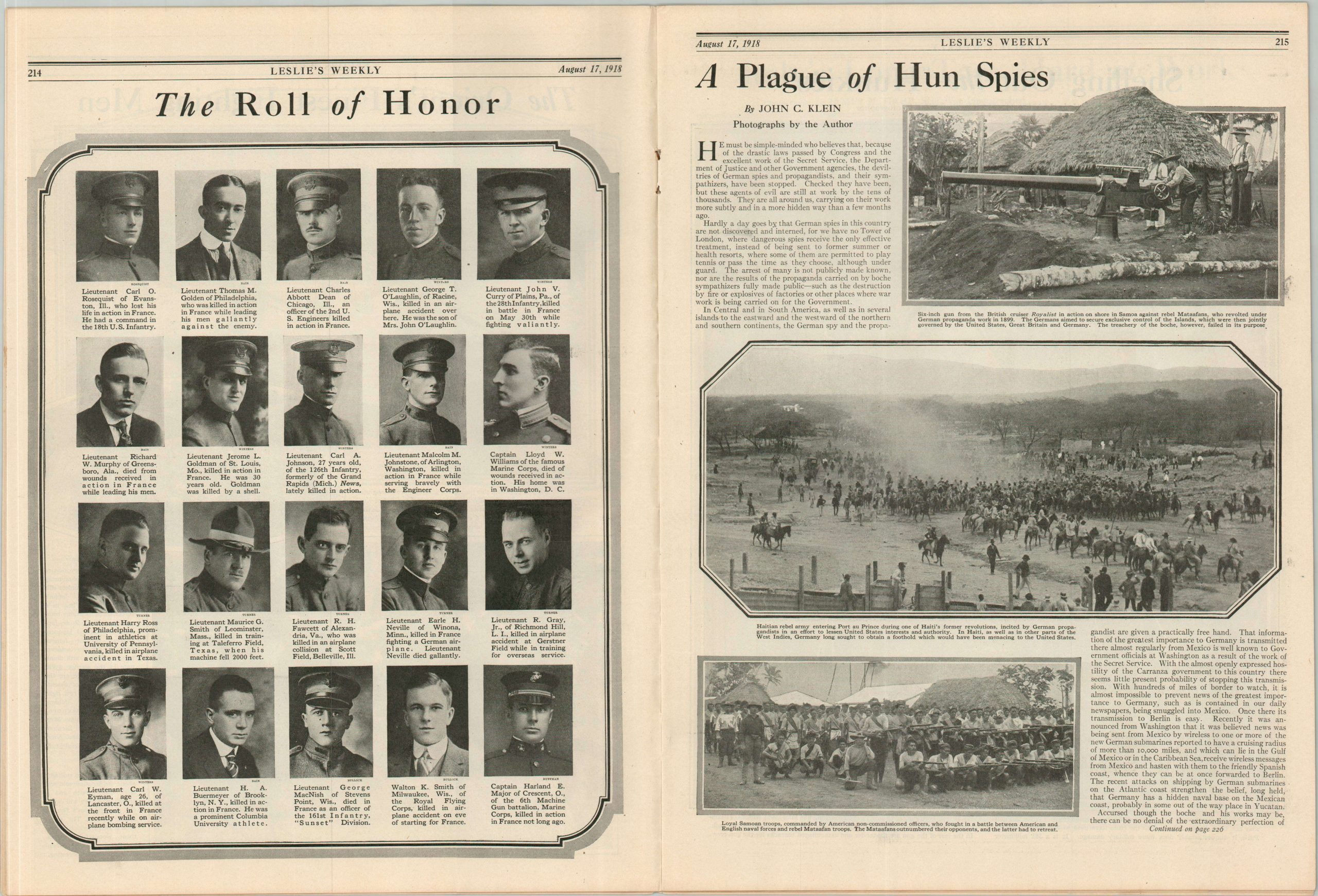 Condition Description: Complete issue of the August 17, 1918 edition of Leslie's Weekly. Trimmed fore edge, as issued, and a few small spots along the outer edges. Very good condition overall.