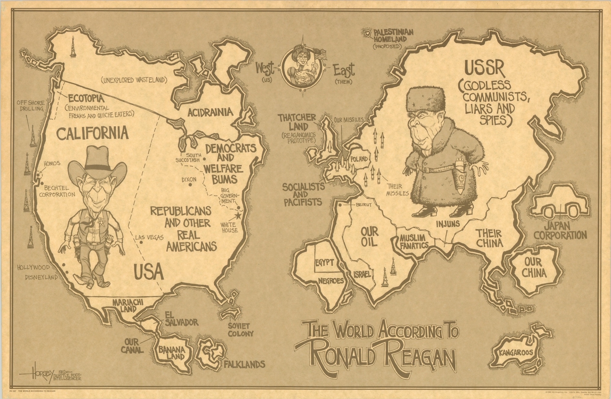 This satirical pictorial map imagines the world from the perspective of Ronald Reagan. The image is rife with political humor from the early 1980s, reflecting perceived geographic ignorance in the Republican administration.