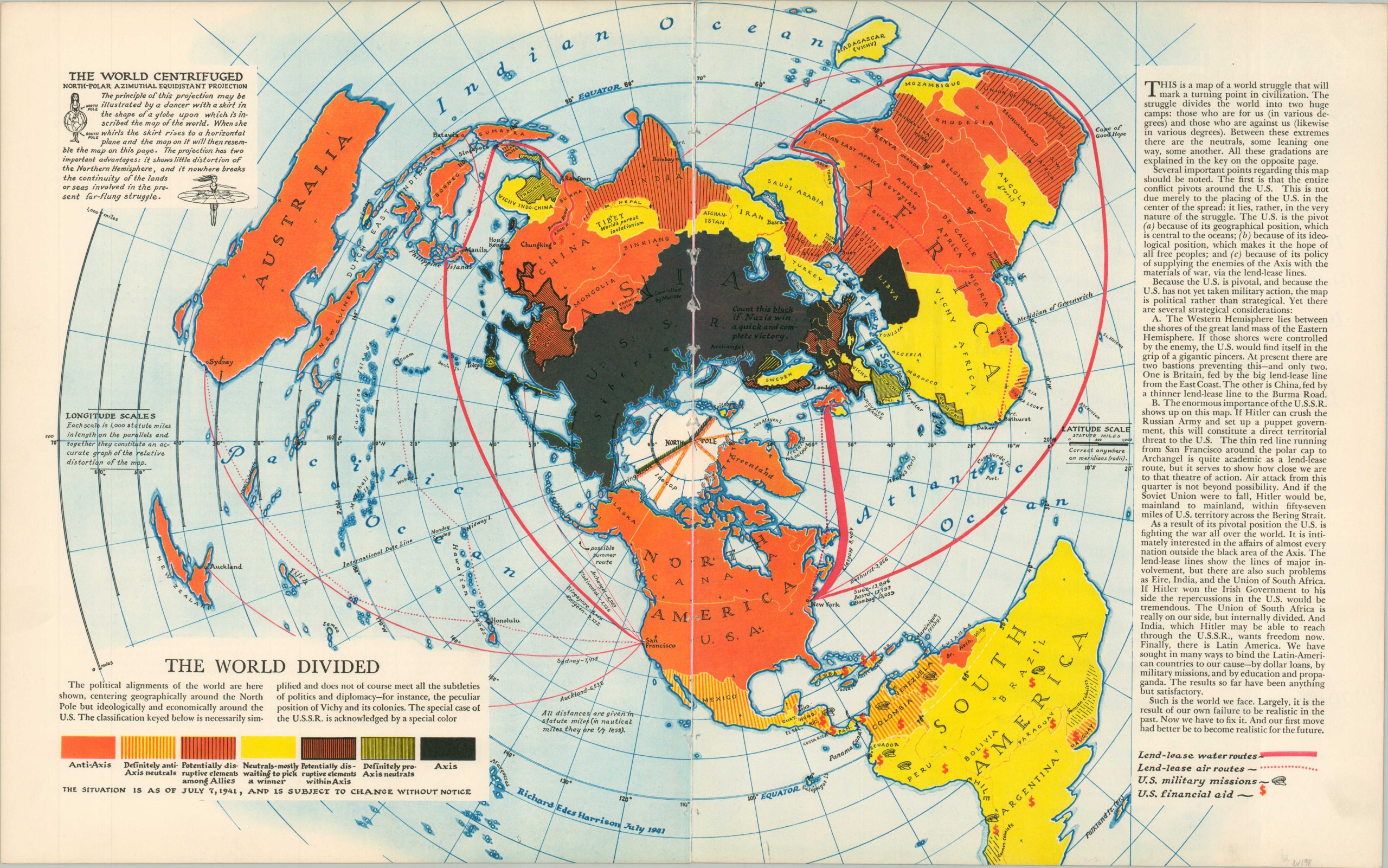 This color-coded world map shows the general persuasion of each nation’s involvement in the early years of the Second World War (July, 1941). An azimuthal equidistant projection, defined in the upper left, presents the globe with a distorted perspective designed to highlight distances by air and sea. U.S. Lend-Lease routes, military missions, and financial aid are also noted according to the legend it the lower right.