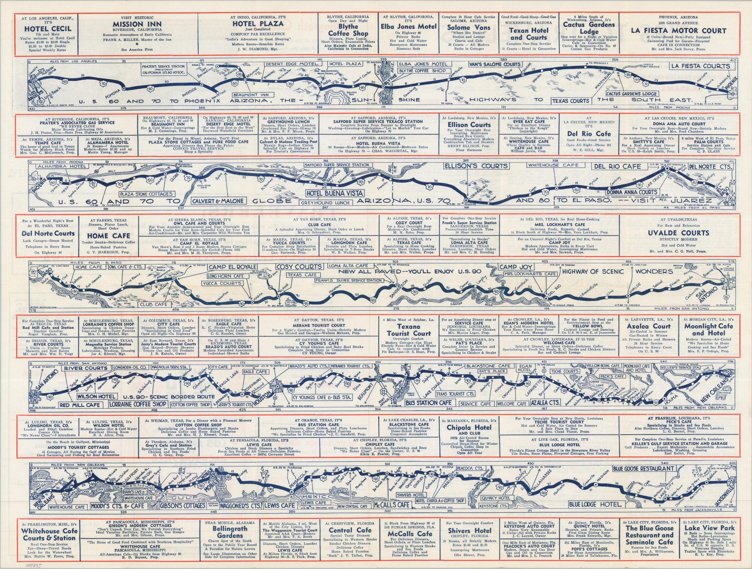 This fascinating promotional piece offers helpful ‘Tips to Tourists’ headed along a promoted east-west route connecting Jacksonville, Florida to Los Angeles, California via U.S. highways 60, 70, 80, and 90. A somewhat simple (if cluttered) strip map is divided into five segments, each noting towns, distances between points, and major geographic features. Recommended hotels, restaurants, and attractions are provided adjacent to many of the stops along the way – giving the impression that the advertisements are more important than information about the route itself! Further advertisements and copy text, organized by state, are provided on the verso, as well as a small map to the recently opened Bellingham Gardens.