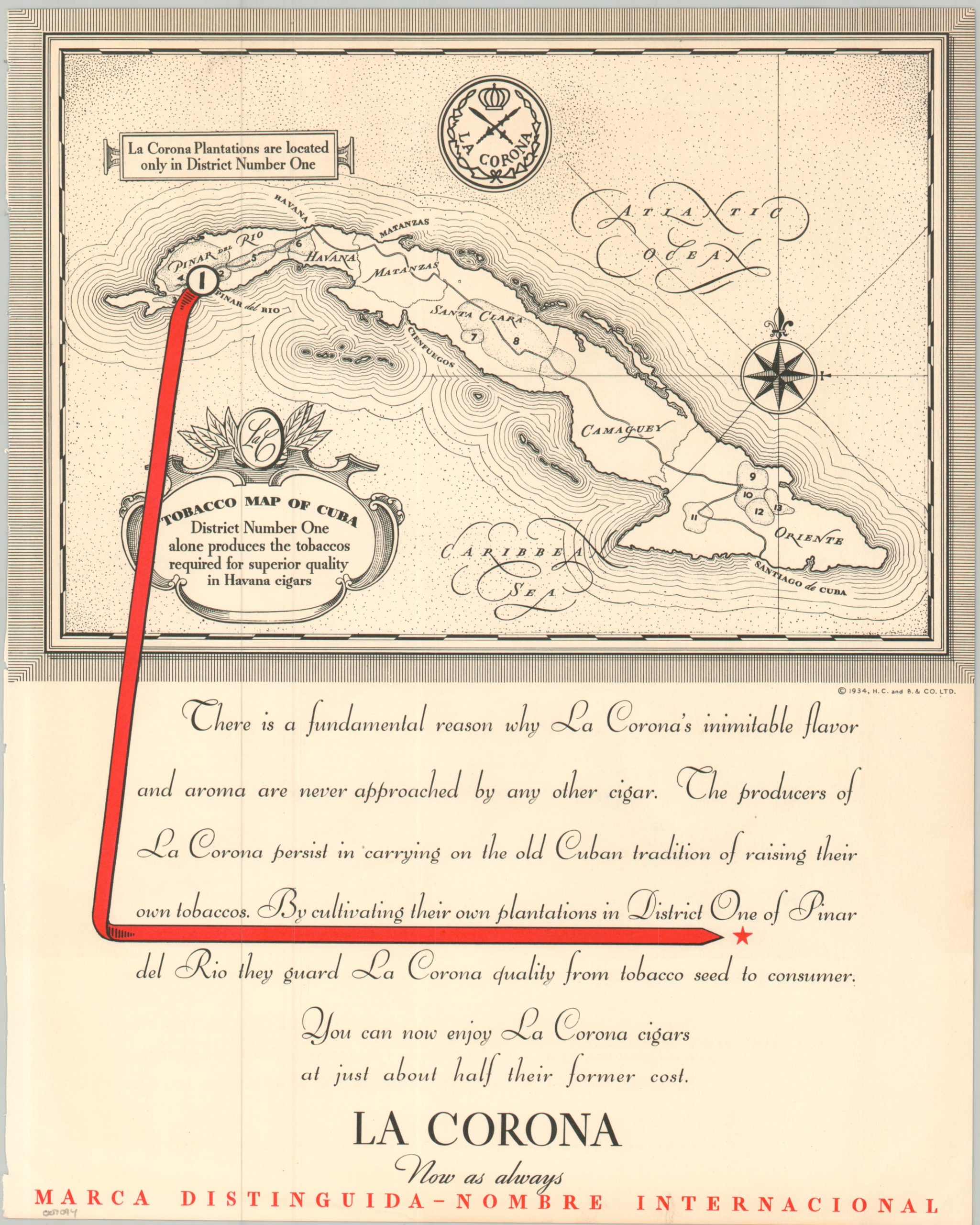 This simple little map, issued in a 1934 issue of Fortune Magazine, shows the island of Cuba divided into thirteen different tobacco-growing districts. Accompanying text assures the audience that La Corona Plantations are only located in District Number One and District Number One alone produces the tobaccos required for superior quality Havana cigars. Plus, the cigars are now available at just about half their former cost!