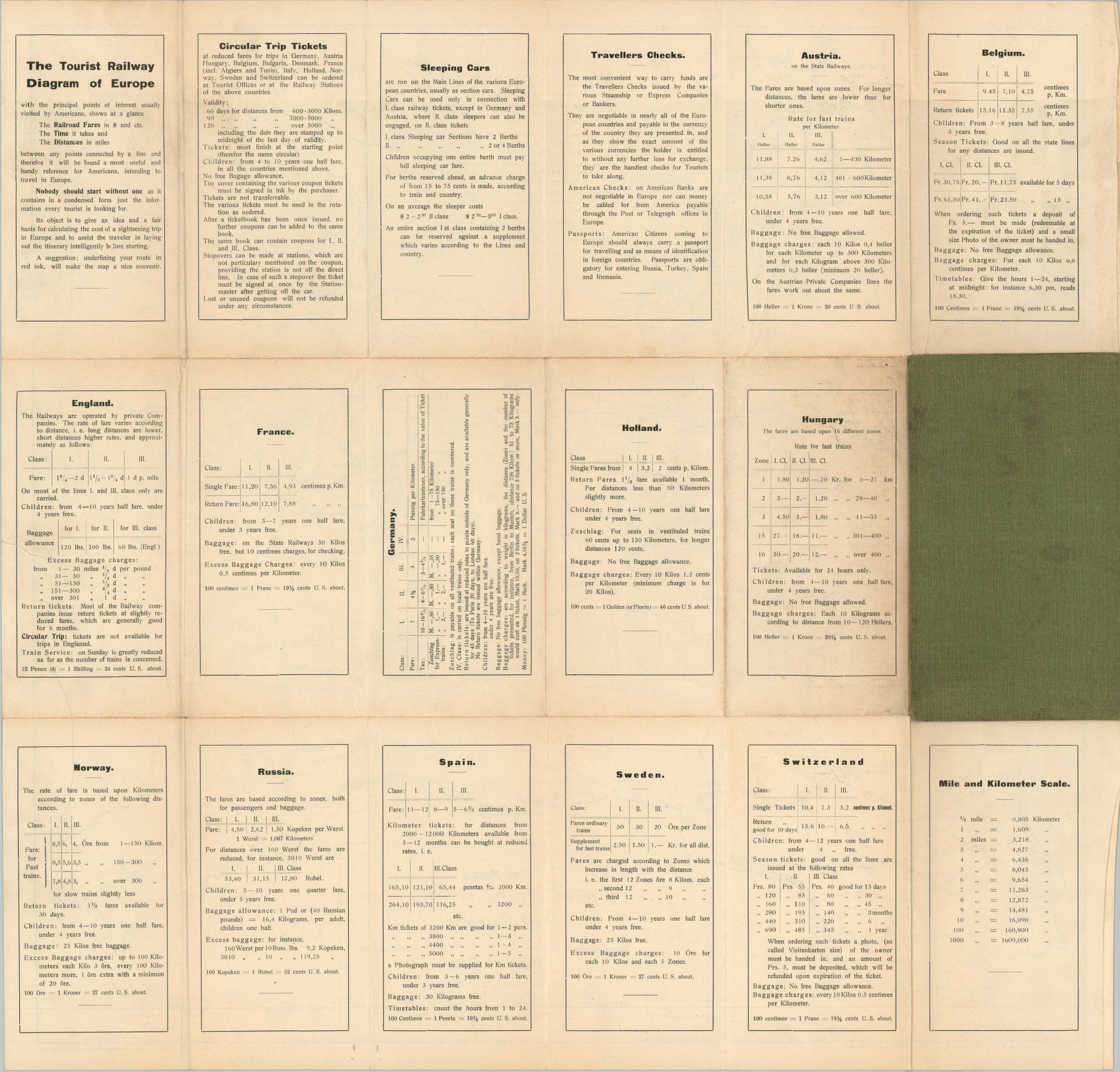 This clever diagrammatic map of Europe omits most cities, geographic features, and transportation options in favor of a straightforward route planner. Railway lines stretching from Inverness to Palermo and between Gibraltar and St. Petersburg are accompanied by approximate travel time in hours (red) and estimated fare rates for different classes. Transatlantic steamer ports are underlined in red and additional transportation details for each European nation are provided on the verso, in addition to general travel information.