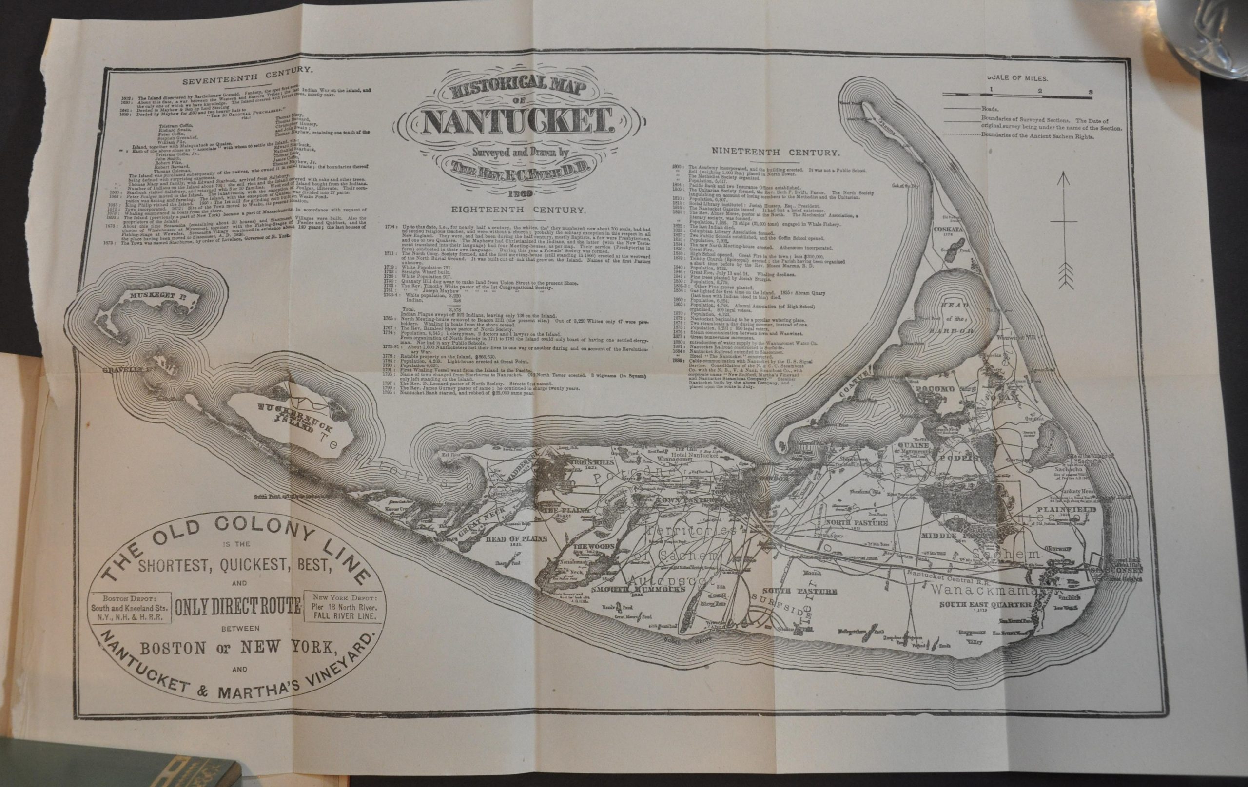 Information about local accommodations, locations of interest, and historic events are accompanied by black and white photographs, contemporary advertisements, and three folding maps. They are a Sectional Map of the New York New Haven, and Hartford Railroad South Shore, Nantasket Beach and Plymouth Lines (Rand Avery Supply Company); Old Colony Line Map of Martha’s Vineyard and the Summer Resorts of Buzzard’s Bay and Vineyard Sound (H.F. Walling); and Historical Map of Nantucket Survey and Drawn by the Rev. F.C. Ewer D.D. 1869 (Ferdinand Ewer).