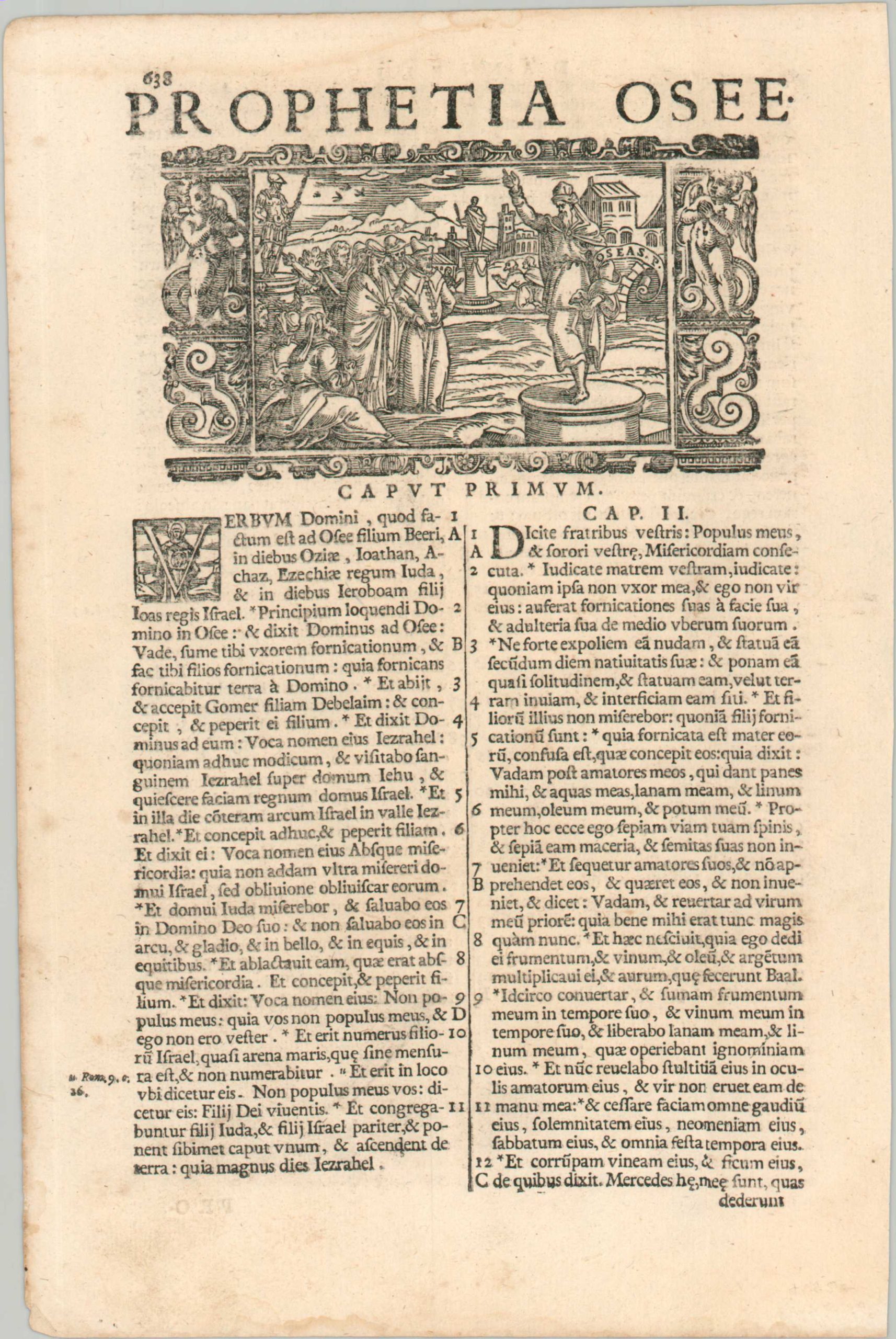 This pair of double-sided Bible leaves with Latin text and small woodcut illustrations was originally published in Venice in 1669 by Nicola Pezzano. One sheet includes the beginning of the First Epistle of John and features St. John the Evangelist on Patmos. The “O” initial shows a kingly figure on a throne, possibly representing God the Father. The second sheet is topped with a scene of the Prophet Hosea preaching to a crowd, with the initial “V” showing St. Vernonia holding the veil with the image of Christ’s face.