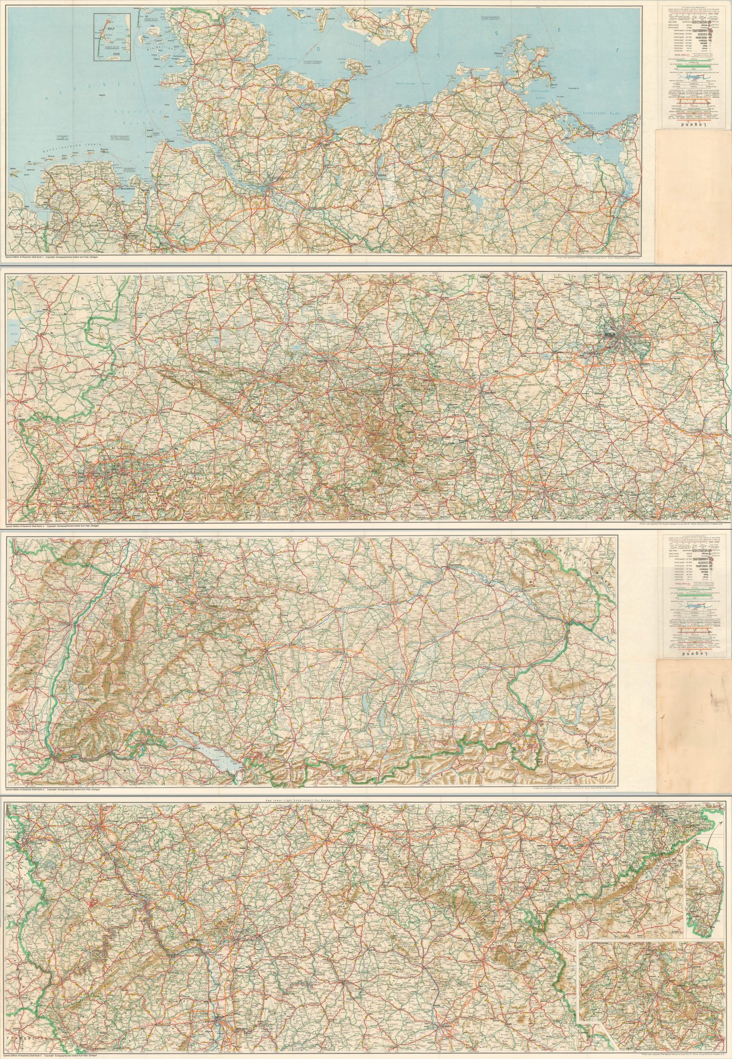 This pair of road maps are updated editions of versions created by the Kartographisches Institut Kurt Mair of Suttgart on behalf of Deutsche Shell. They were printed in Frankfurt Am Main in November of 1951 by George Stritt & Co. under agreement with the 7714 Engineer Intelligence Group of the United States Army.