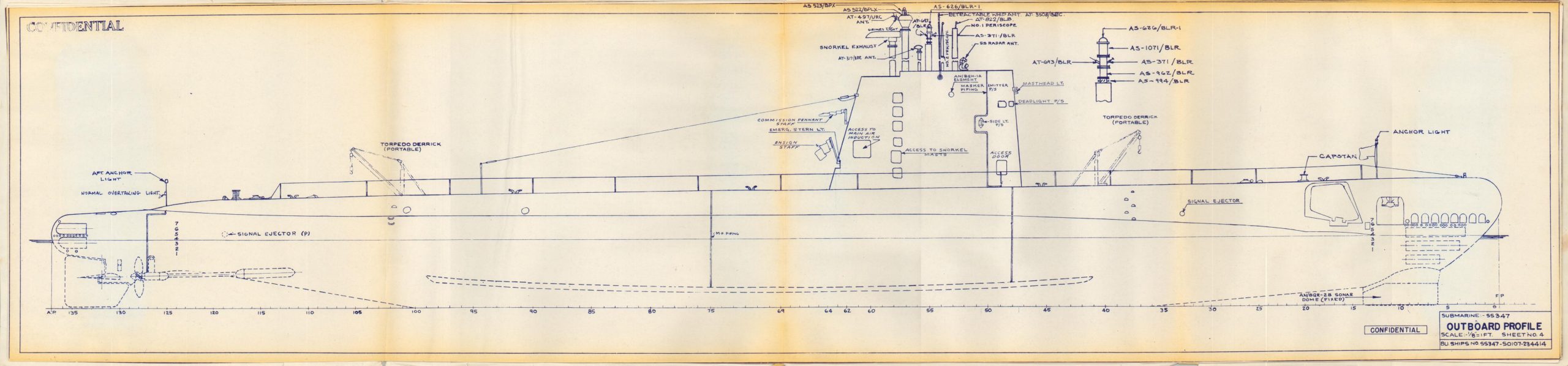 According to the front cover, the blueprints originated with the Cubera’s commissioning in December ’45. A nearby table of revisions indicates a latest date of October 1969, less than three years before the sub was decommissioned and sold to Venezuela. The contents provide detailed dimensional data, profile views, deck plans, and cross-sections of the entire ship.