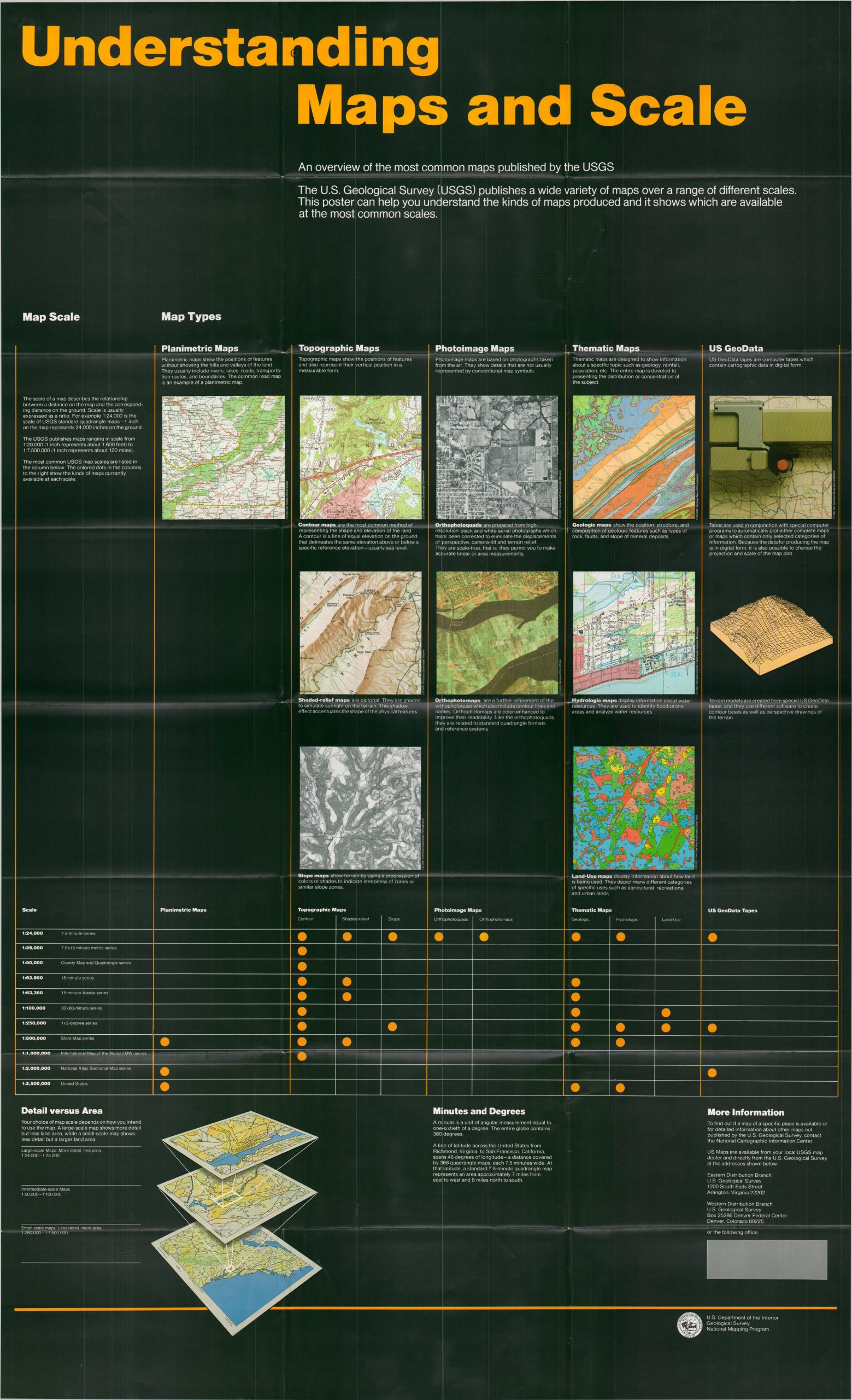 This helpful visual cross-reference outlines the different types of maps issued by the United States Geological Survey. Various scales and types are listed, with features for each explained via captioned images.