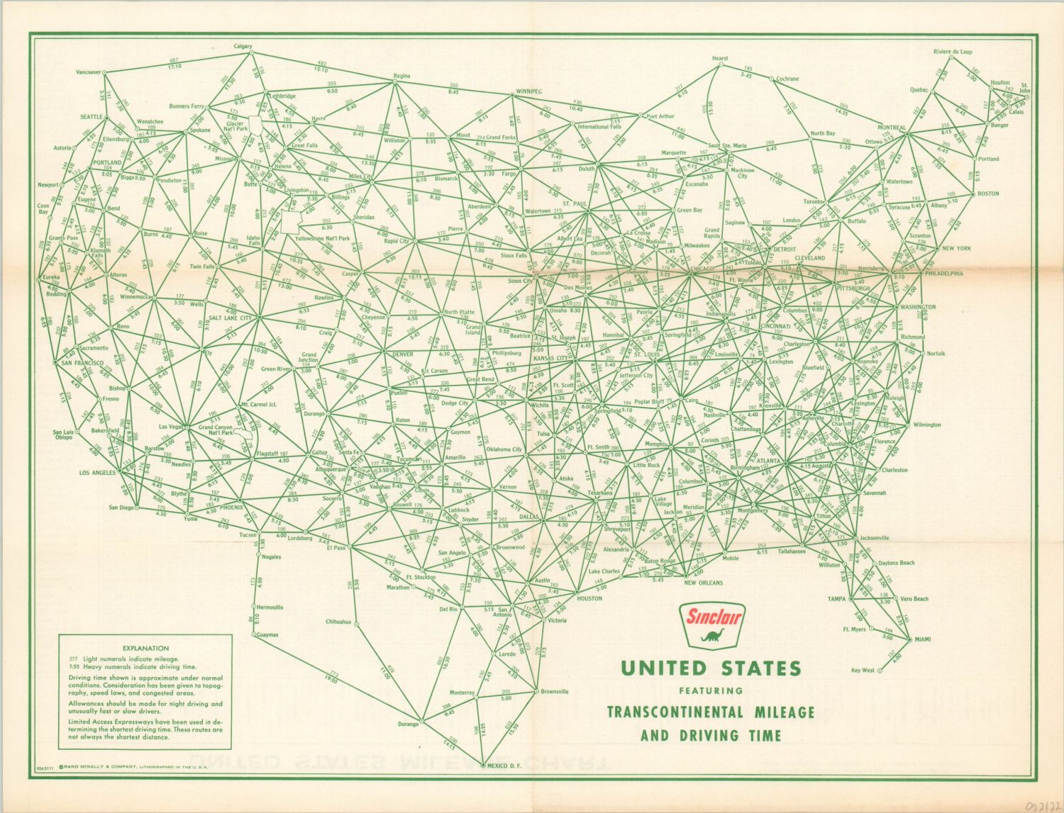 This novel depiction of America was issued around 1965 by Rand McNally on behalf of Sinclair Oil. Seeking to provide an easy to comprehend trip-planning guide, the map provides the distance and driving times between hundreds of various destinations in the U.S., Mexico, and Canada.