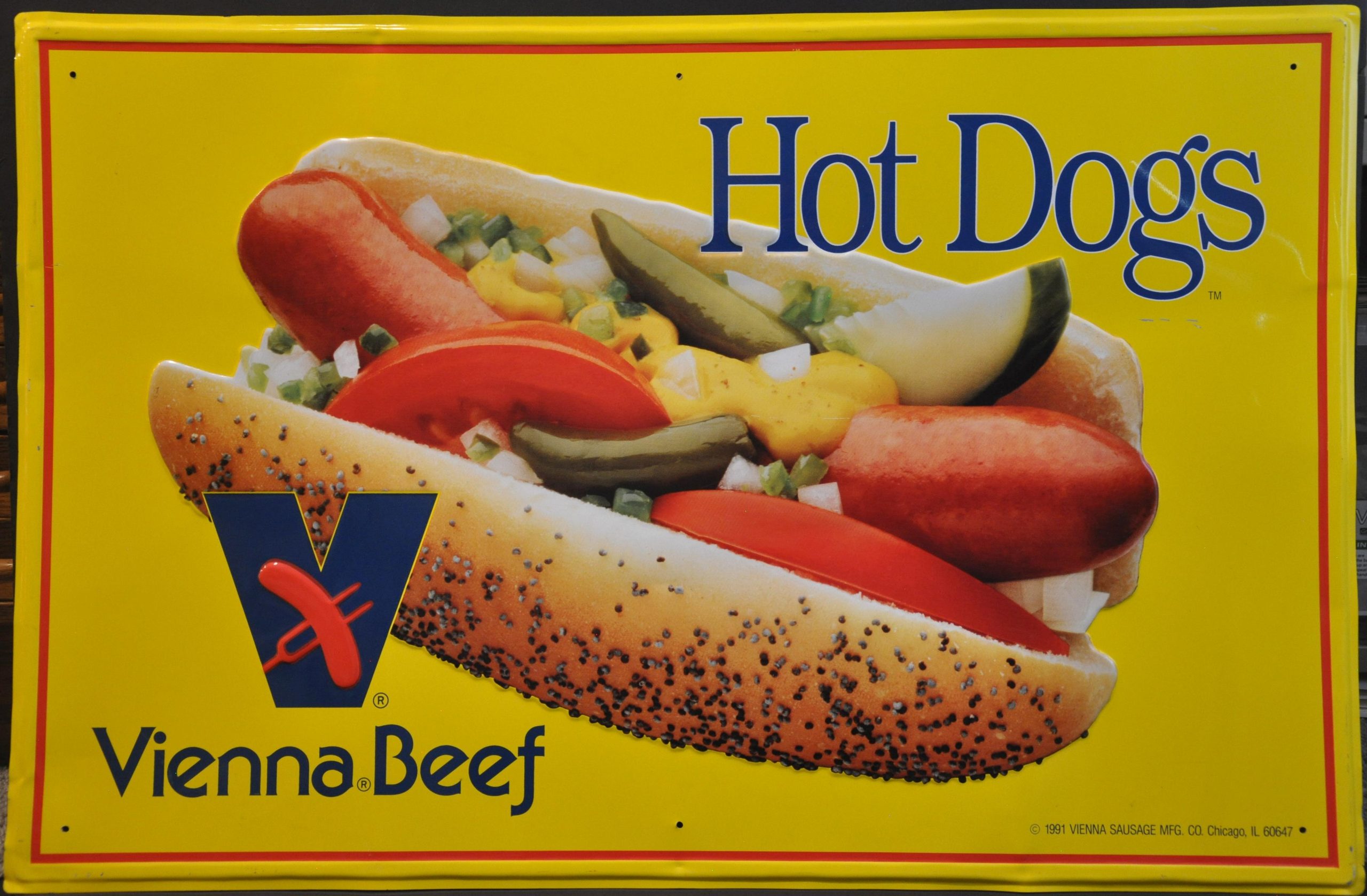 Steamed poppyseed bun, neon relish, chopped onion, dill pickle spear, tomato slices, sport peppers, yellow mustard, celery salt, and, of course, a 100% Vienna Beef hot dog. Once you have all those things, you are ready to make a delicious Chicago-style dog (note the important absence of ketchup). But until then, you’ll have to enjoy this metal sign, distributed by Vienna Beef in 1991 for hanging in local restaurants. ’91 was a good year for Chicago, as the Bulls started the dynasty that would win six championships between then and 1998.