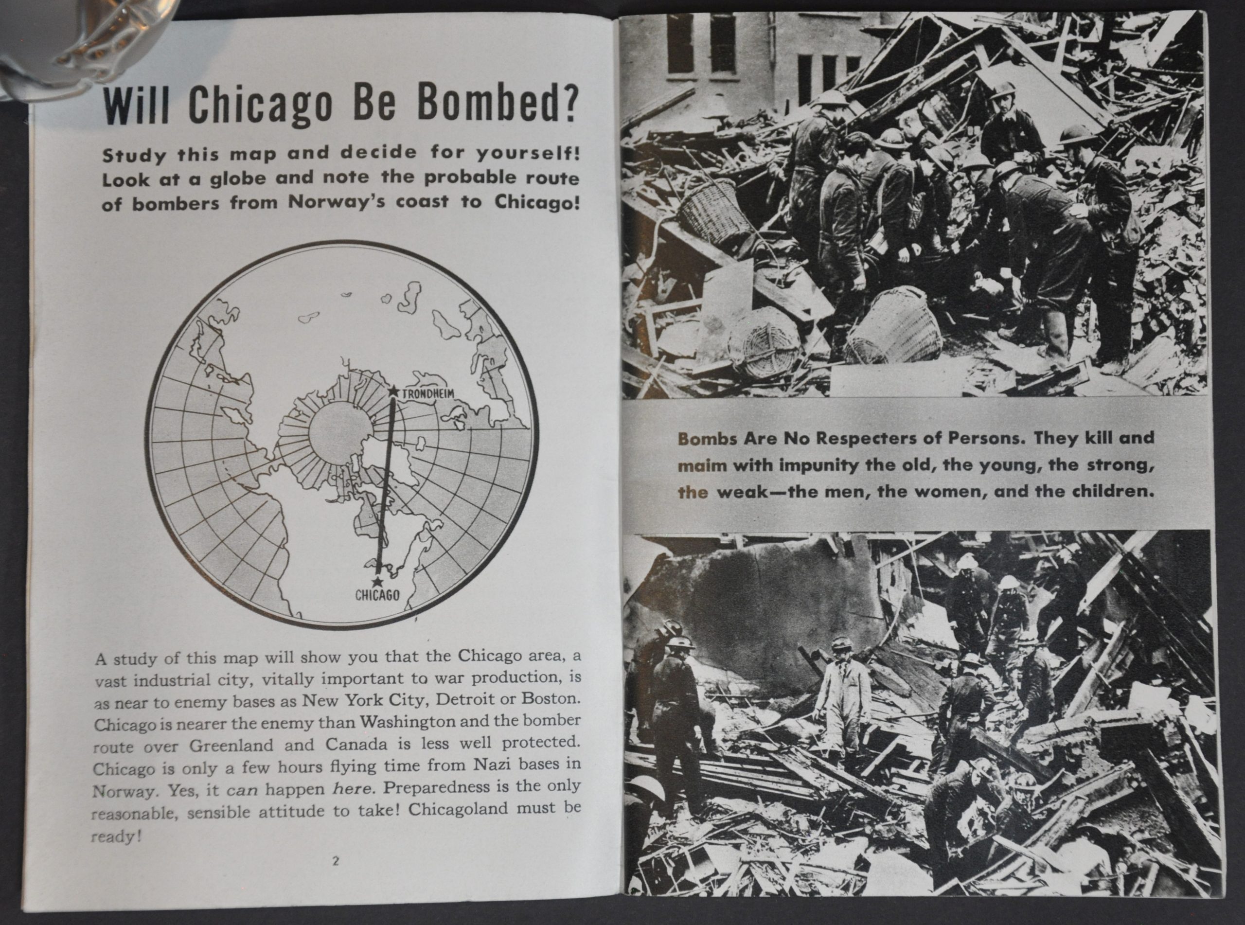 “Chicago is nearer the enemy than Washington and the bomber route of Greenland and Canada is less well protected. Chicago is only a few hours flying time from Nazi bases in Norway. Yes, it can happen here.” – pg. 2