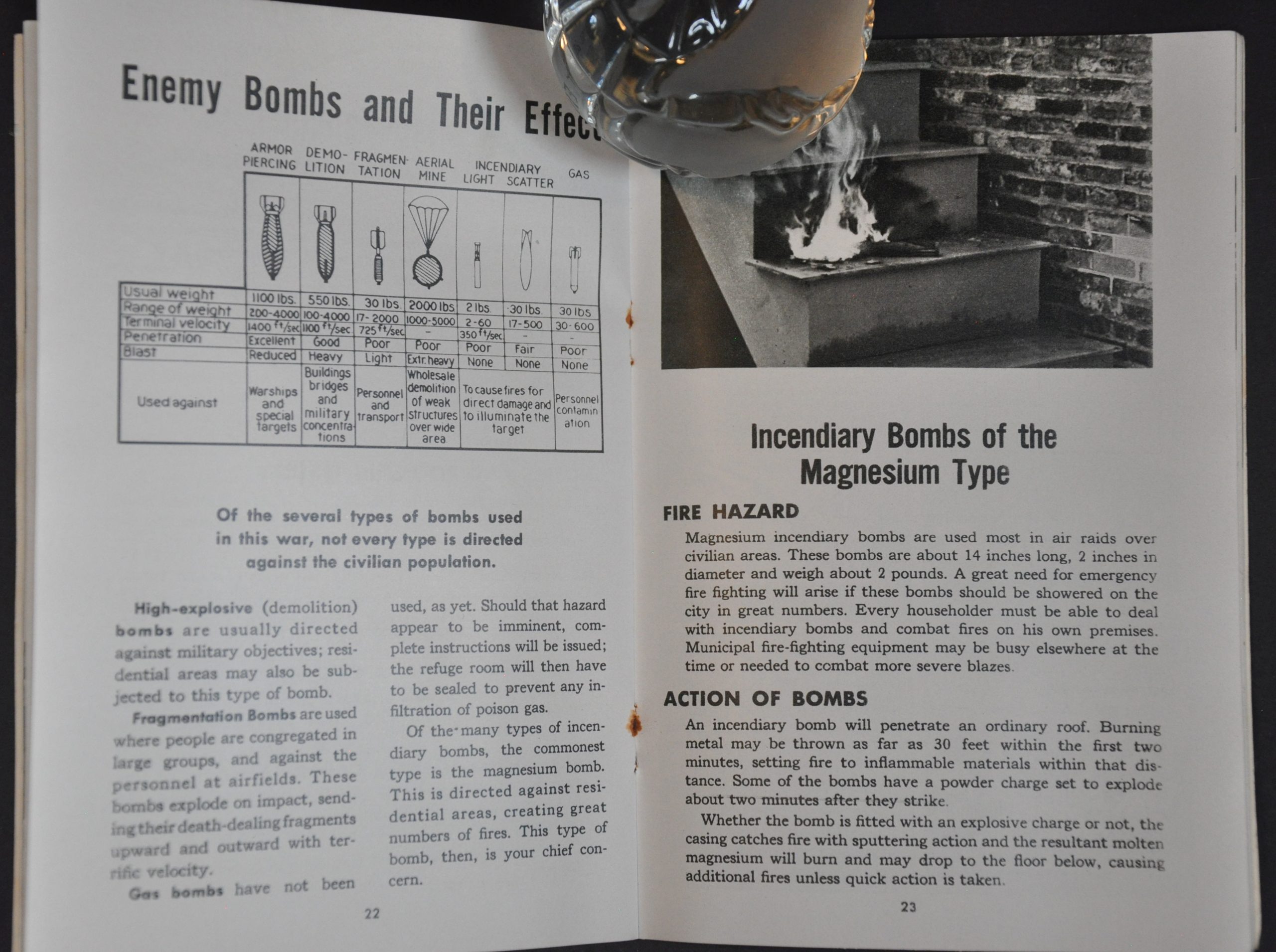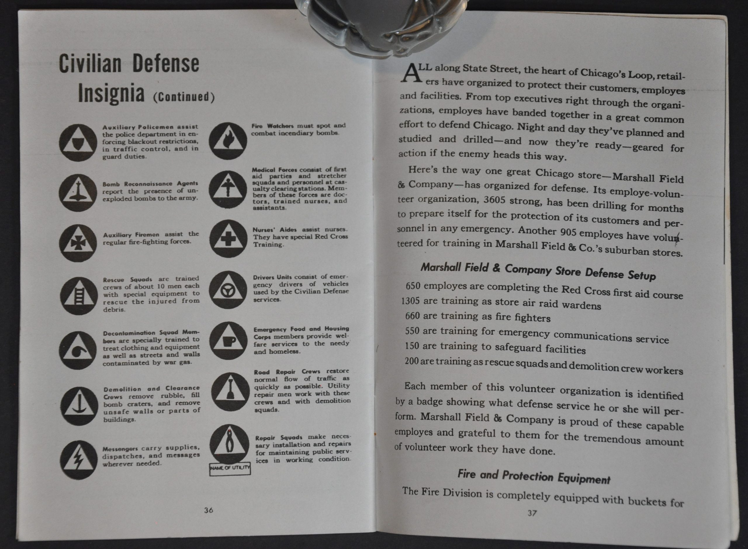 Those alarming (if somewhat overstated) words are presented, along with a map, on the second page of this air raid preparation booklet. It was issued by the Chicago Metropolitan Area Office of Civil Defense and published by Marshall Field & Company in 1942 (the company had over 4,000 employees in the organization). The small volume’s 40 pages include information on preparing for a bombardment at home or in public, fighting magnesium fires, detecting different chemical weapons, and much more.