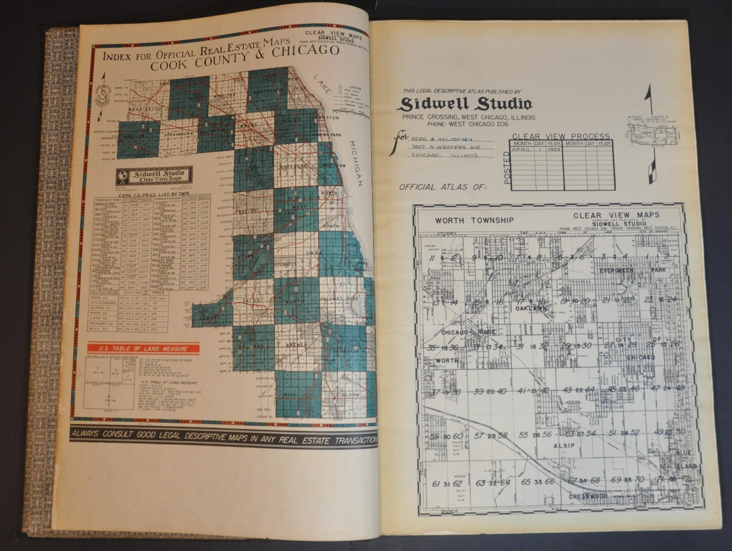 This ‘Legal Descriptive Atlas’ was published in April of 1953 by West Chicago’s Sidwell Studios on behalf of Berg & Halvorsen, a Chicago real estate firm. A price sheet on the colorful index map of Cook County indicates the volume originally sold for $99 (for the screw-post leatherette edition) and was one of various issues covering the entire county.