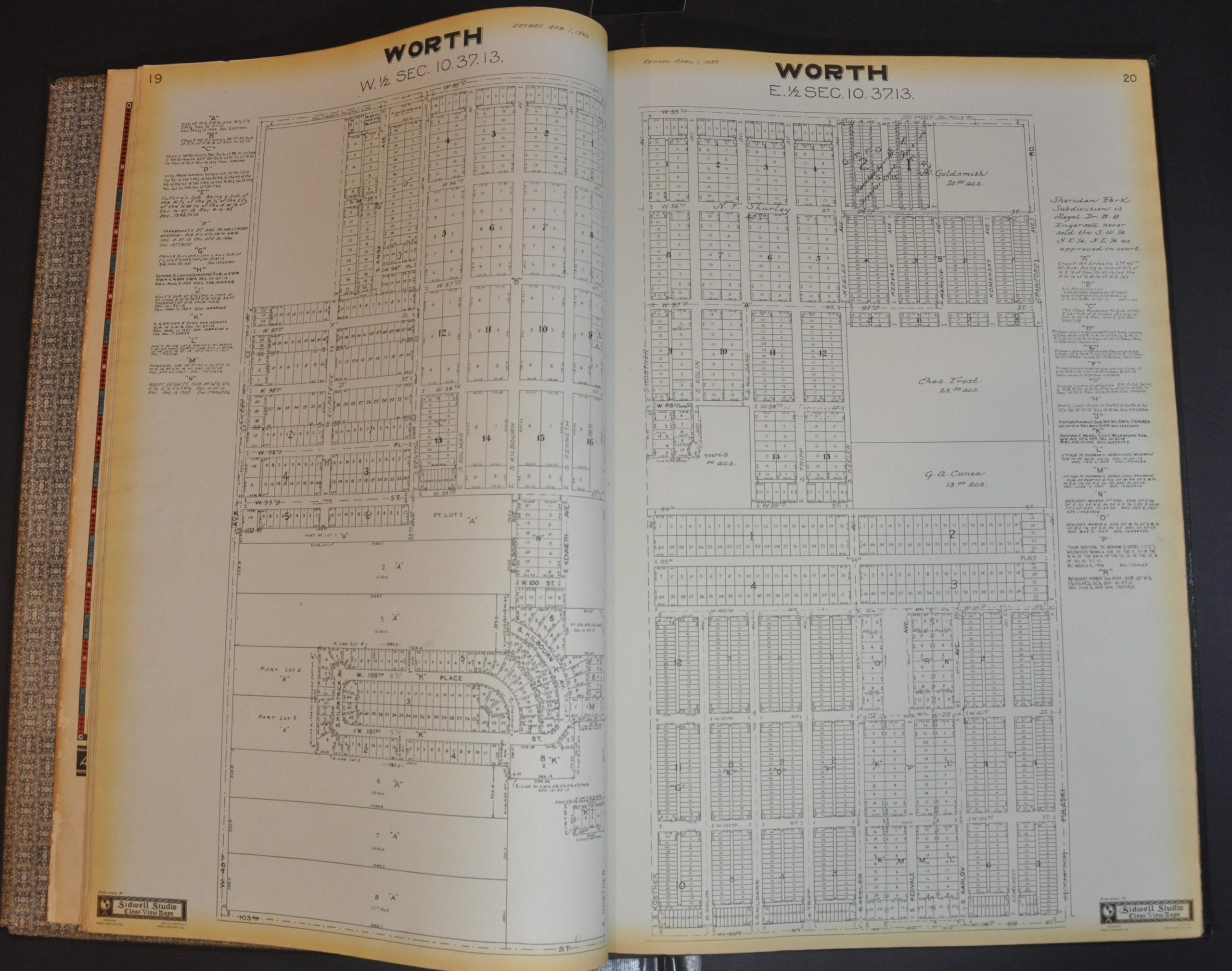 This particular example is comprised of 73 folio pages that provide a descriptive overview of Worth Township; including the communities of Oak Lawn, Evergreen Park, Alsip, and Chicago Ridge. Each sheet has been revised to the late 1950s and presents a wealth of information on parcel sizes, property ownership, local infrastructure, transportation routes, and geographic features.
